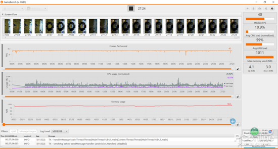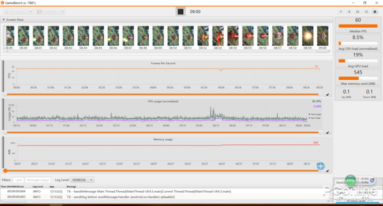 我们对王者荣耀分别进行了两次测试,在GameBench软件显示:W2019整体平均帧率为满帧:60帧,正常游戏帧率无波动,极其稳定的表现,6分13秒结束游戏。CPU平均占用率为8.5%,GPU占用率为:19%。内存占用为:545;得益于高通骁龙845处理器,所以王者荣耀整体表现评分:A;