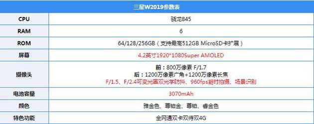 三星W2019内外均采用4.2英寸Super AMOLED屏幕材质,分辨率为1920*1080,525ppi;显示效果,色彩还原度极佳,无论是拍照成像,还是观影视觉体验,整块屏幕都能带来极为优秀的视觉体验效果。