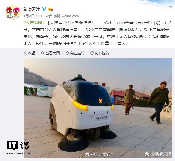 据津云的报道,1月2日,天津市首台无人驾驶清扫车“蜗小白”在天津市南翠屏公园调试运行。“蜗小白”配备了激光雷达、摄像头、超声波雷达等传感器于,是一辆无人驾驶功能的清扫车。