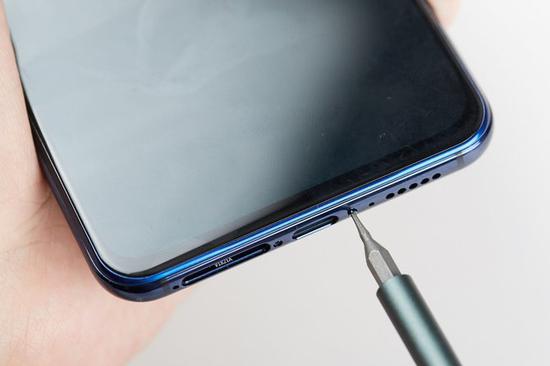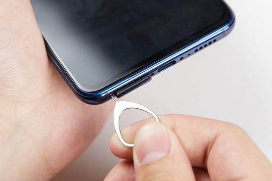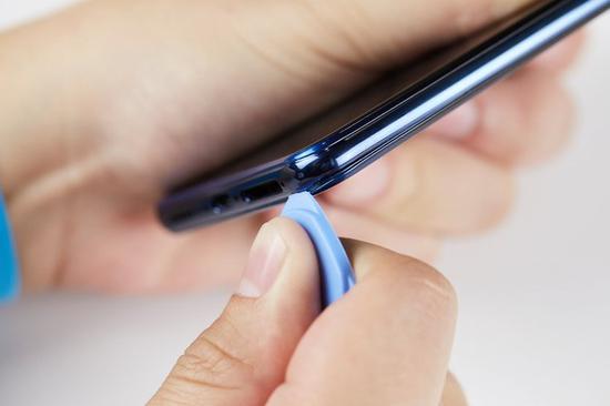 在拆解之前按惯例将手机关机,然后使用手机附送的卡针,将位于手机下方的卡托取出。需要注意的是,不要用其他工具插入卡托孔,以防卡托孔损坏、无法取出卡托。
