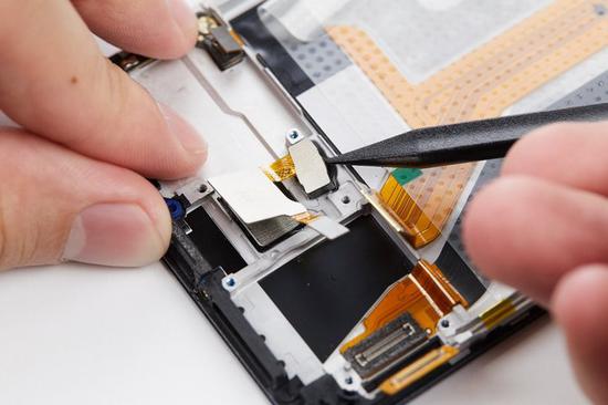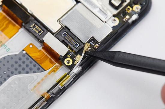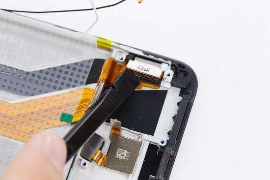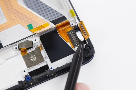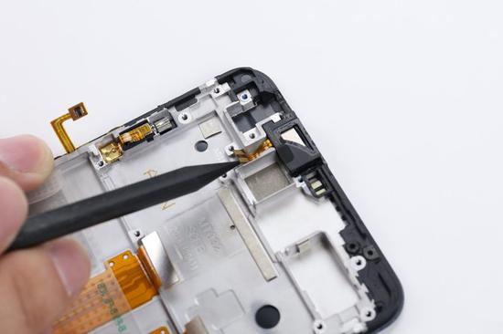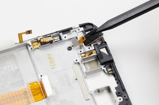 接着使用撬棒尖端将听筒顶起,然后往右缓慢地将听筒取出。注意不要用力拉扯,这里的FPC排线比较脆弱,用力拉扯可能会扯断排线。