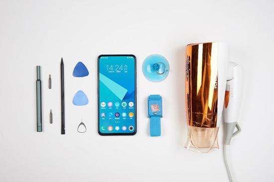 不知道vivoNEX双屏版的内部有没有特殊设计,所以工具也就先准备了常规用的。它们从左到右分别是:十字螺丝刀、六星螺丝刀,撬棒,卡针,薄拆机片,拆机片,卡针,吸盘,防静电手环和电吹风。