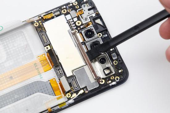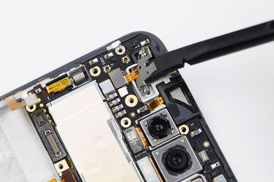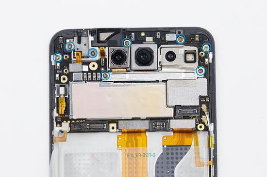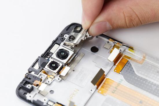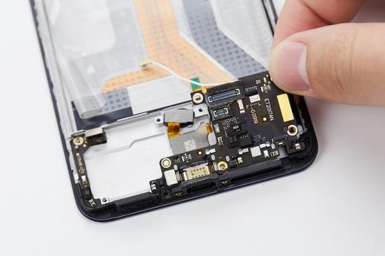 这次vivo NEX双屏版的摄像头和相关传感器的数量众多,要取出主板需要先处理摄像头排线。首先将摄像头排线上的保护支架撬起取出。