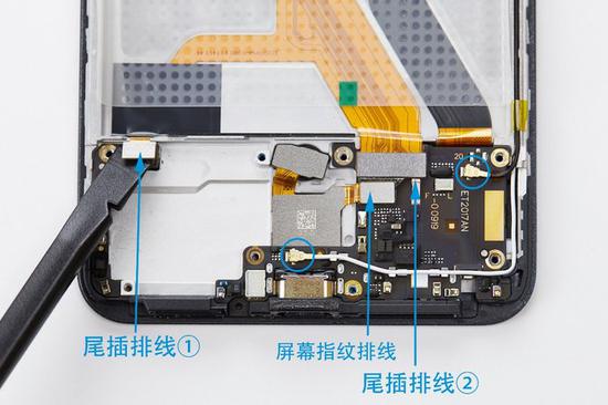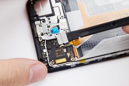 在屏幕指纹IC处,有一个小小的拆卸口。使用撬棒尖端,从这拆卸口撬起屏幕指纹IC。