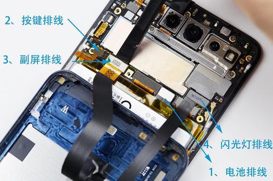 接下来,使用撬棒,将图中标识的排线电池排线、按键排线、副屏排线、闪光灯排线撬起、断开,其他排线暂时不需要断开。注意,需要优先断开电池排线。