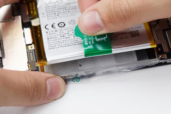vivo NEX双屏版的电池依旧是用了vivo一直以来的快拆设计,可以较为快速的将电池拆卸出来。拆卸电池主要有以下几个步骤,首先要拉起F层薄膜,将薄膜压到另外一侧、与电池完全分开。