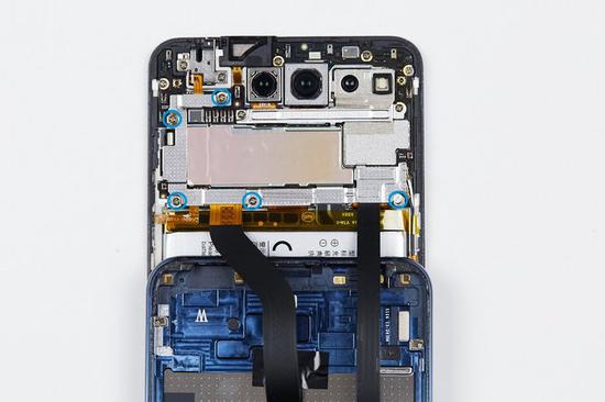 因为结构的关系,vivo NEX双屏版的主板上还使用了几个螺丝固定。要拆解主板,需要使用十字螺丝刀将图中标识的几个螺丝全卸下来。