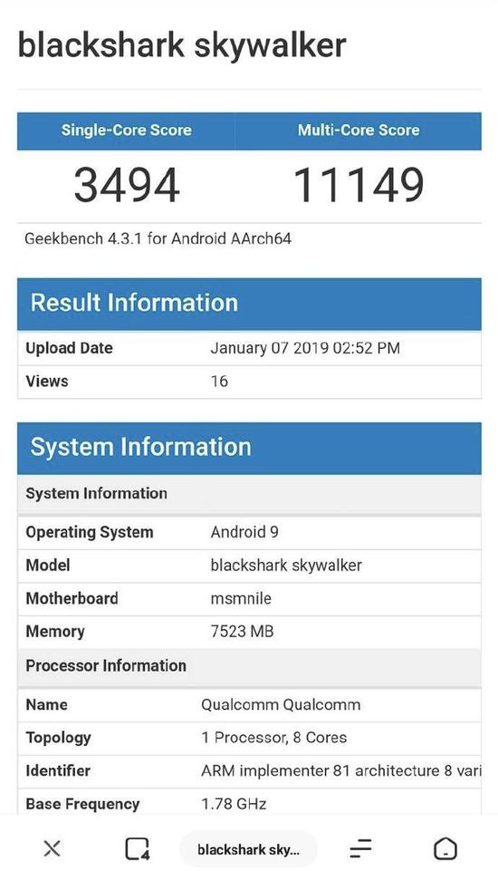 根据 GeekBench 跑分,黑鲨 skywallker 搭载骁龙855处理器,内置8GB内存,预装Android 9系统。代号译为中文为黑鲨·天行者,不免让人联想到卢克·天行者(英语:Luke Skywalker),他是一名为乔治·卢卡斯导演的著名科幻电影《星球大战》正传三部曲中的主要人物。《星球大战》是一个热门IP,黑鲨游戏手机以此命名很合适,目前“blackshark skywalker”可能只是内部代号,正式命名还未知晓。