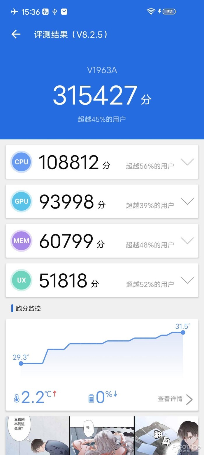 而且vivo还对散热有着很高的要求,硬件方面,vivoZ6的内部拥有85mm的超长液冷散热管,核心温度能够迅速降低10°C,而且还有总面积超过10000平方毫米的多层石墨散热膜。软件方面,CoolingTurbo智能热管理策略可以让手机时刻“冷静”,既能保证温升体验,又能大幅度提升性能。得益于PC级超级液冷散热系统,所以vivoZ6的温控表现也很出色,跑分期间温度才涨了2度(从29°到31°,外部温度基本没有变化),而且一格电都没有掉。